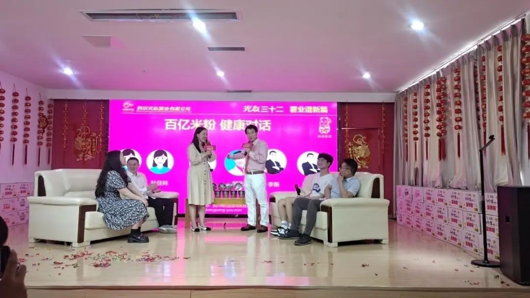 為更直觀(guān)地了解光友薯類(lèi)健康主食,本次活動(dòng)還特別邀請五位嘉賓上臺與鄒光友董事長(cháng)現場(chǎng)健康對話(huà),對話(huà)的嘉賓分別是綿陽(yáng)城市學(xué)院雙創(chuàng )中心主任李衡、綿陽(yáng)市靖華節能環(huán)??萍级麻L(cháng)王華、四川敬科智能裝備科技副總經(jīng)理肖飛雨、綿陽(yáng)西城大學(xué)生創(chuàng )新創(chuàng )業(yè)園創(chuàng )業(yè)導師杜佳林、綿陽(yáng)城市學(xué)院雙創(chuàng )中心何愛(ài)清,與會(huì )嘉賓在這里共同探討米粉行業(yè)的未來(lái)發(fā)展趨勢及健康飲食的重要性,共享基地帶動(dòng)大學(xué)生創(chuàng )新創(chuàng )業(yè)發(fā)展。