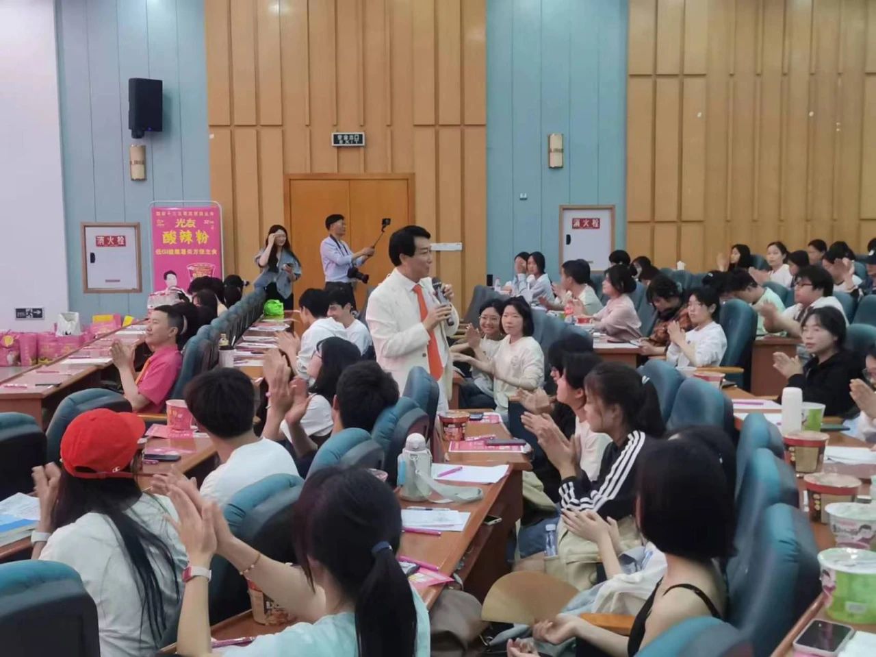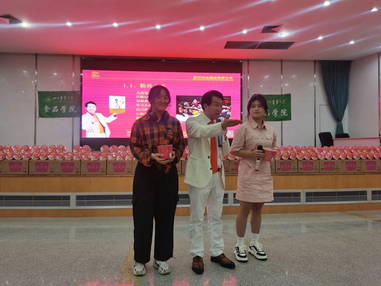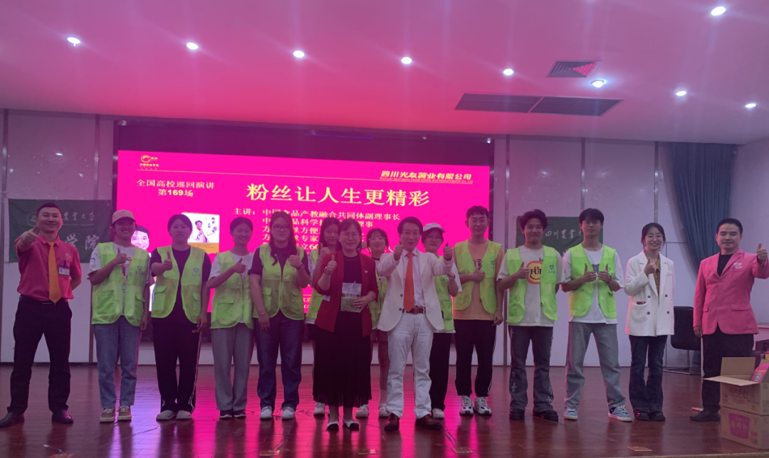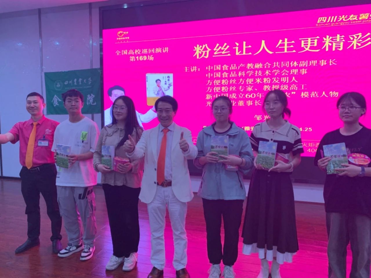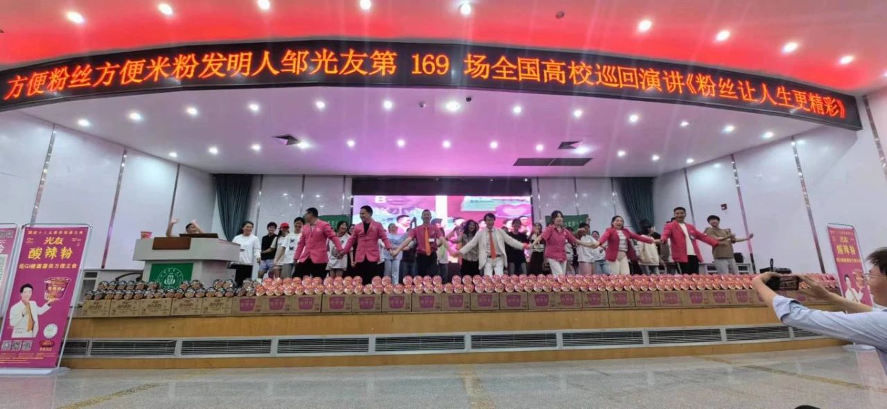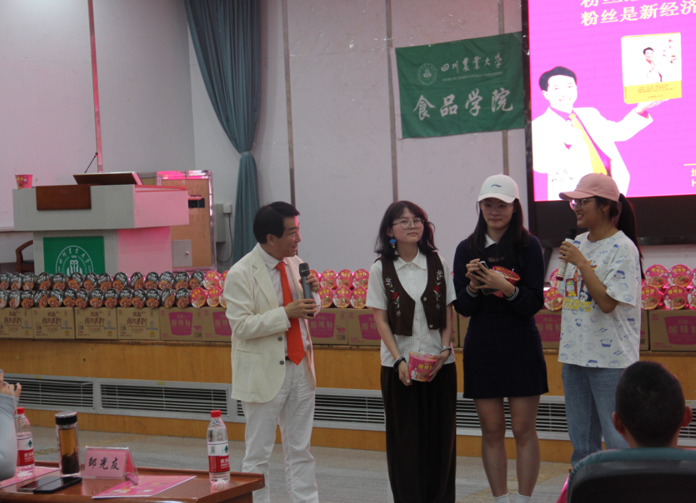 下午三時(shí)許,中國食品產(chǎn)教融合共同體副理事長(cháng)、中國食品科學(xué)技術(shù)學(xué)會(huì )理事、方便粉絲方便米粉發(fā)明人、方便粉絲專(zhuān)家、教授級高工、新中國成立60年“三農”模范人物、光友薯業(yè)創(chuàng )始人、光友薯業(yè)董事長(cháng)鄒光友在四川農業(yè)大學(xué)食品學(xué)院如期舉行全國高校巡回演講第169場(chǎng)——《粉絲讓人生更精彩》,這場(chǎng)關(guān)于創(chuàng )業(yè)的勵志演講大獲成功,近700人的禮堂現場(chǎng)一片歡騰,在座師生和直播間的觀(guān)眾無(wú)不受益良多。