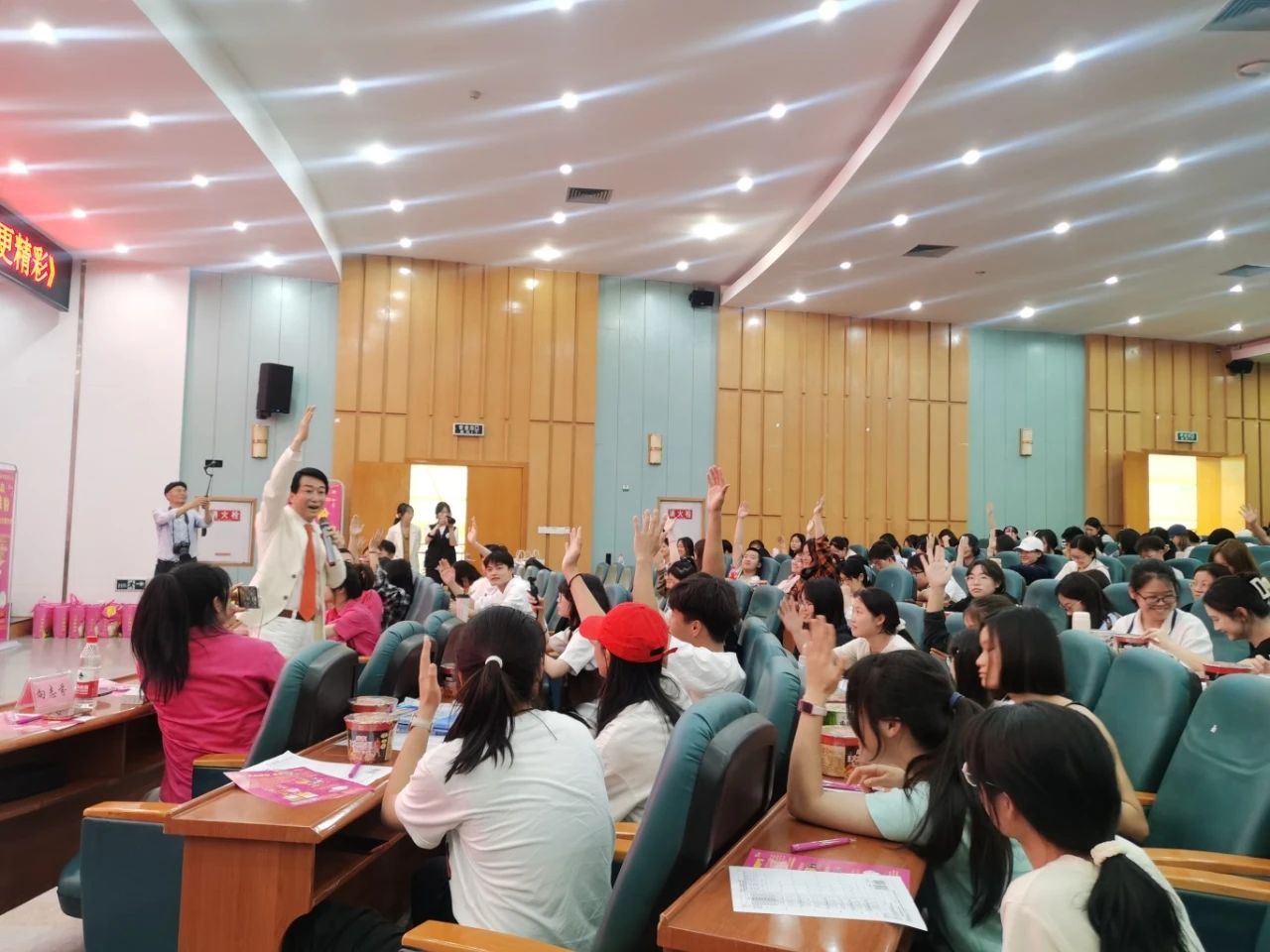 隨后,又進(jìn)行了“改變從舉手開(kāi)始”“與愿意創(chuàng )業(yè)的同學(xué)對話(huà)”“朗誦詩(shī)歌《粉絲心態(tài)》”“分享光友激情三寶”“共跳光友粉絲舞”“共讀意愿百分百詩(shī)”“贈送光友粉絲”等熱情互動(dòng)活動(dòng),同學(xué)們的歡呼聲一浪高過(guò)一浪,現場(chǎng)氛圍逐步推向頂點(diǎn)。
