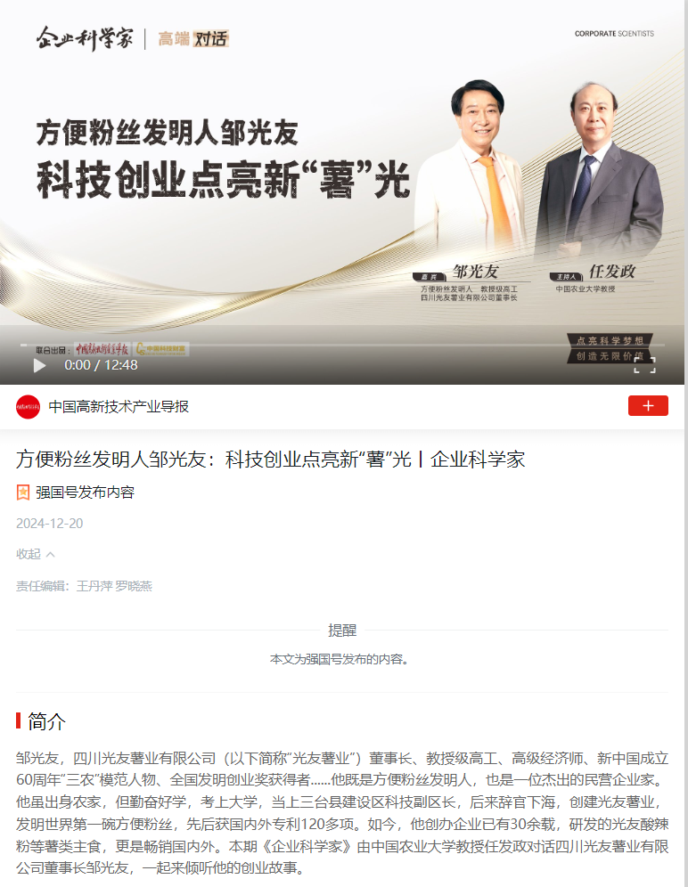 轉載學(xué)習強國中國高新技術(shù)產(chǎn)業(yè)導報——方便粉絲發(fā)明人鄒光友:科技創(chuàng )業(yè)點(diǎn)亮新“薯”光丨企業(yè)科學(xué)家